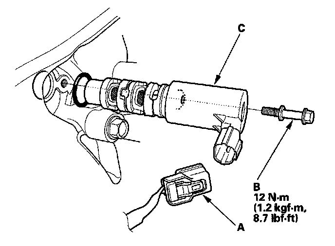 2. Remove the bolt (B) and the VTC oil control solenoid valve (C).