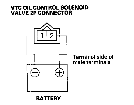 5. Connect the battery positive terminal to VTC oil control solenoid valve 2P connector terminal No. 2.
