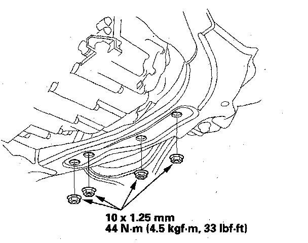 13. Place a transmission jack under the transmission, and remove the transmission lower mount nuts.