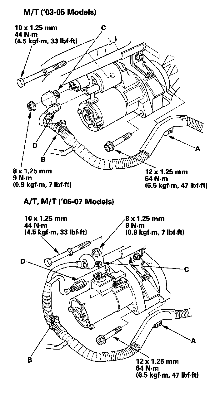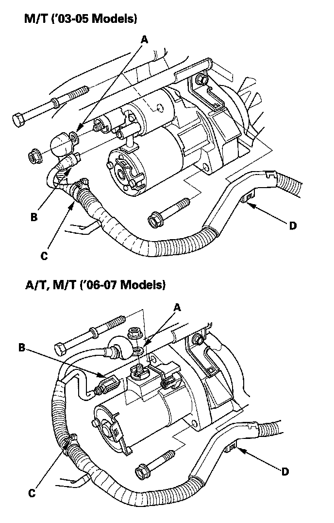 1. Install the starter, then install the harness holder (A) and the harness clamp (B), connect the starter cable (C) and the BLK/WHT wire (D). Make sure crimped side of the ring terminal faces away from the starter when you connect it.