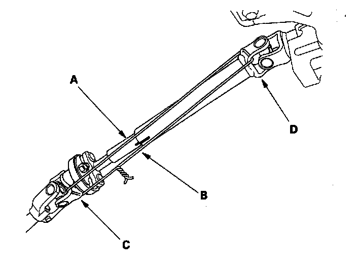 8. Hold the slider shaft (A) on the column with a piece of wire (B) between the joint yoke (C) of the slider shaft and joint yoke (D) of the upper shaft to prevent the slider shaft from pulling out.