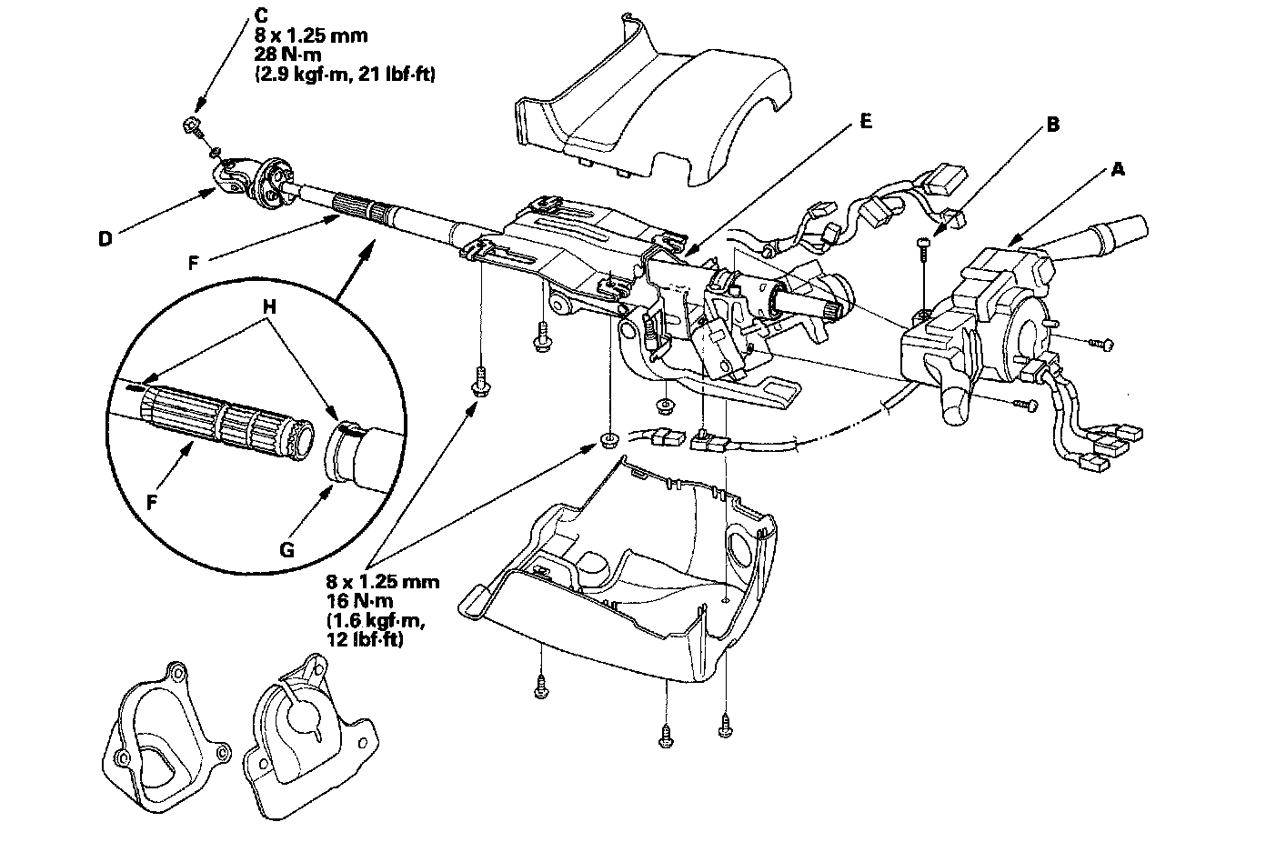 14. Remove the steering column (E) by removing the attaching nuts and bolts. If the lower slide shaft (F) is removed, slip it into the upper shaft (G) by aligning the paint marks (H).