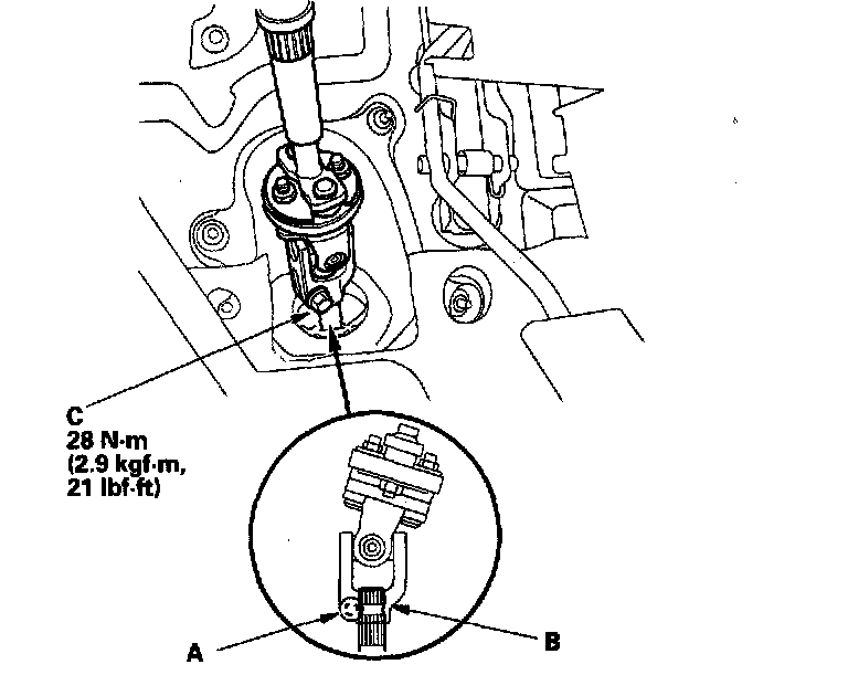 5. Align the bolt hole (A) on the steering joint with the groove (B) around the pinion shaft, and loosely install the joint bolt (C). Be sure that the joint bolt is securely in the groove in the pinion shaft. Pull on the steering joint to make sure that the steering joint is fully seated. Tighten the steering joint bolt to specified torque.