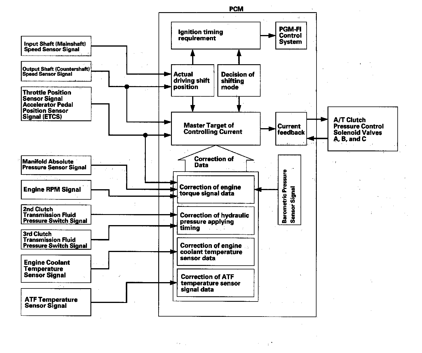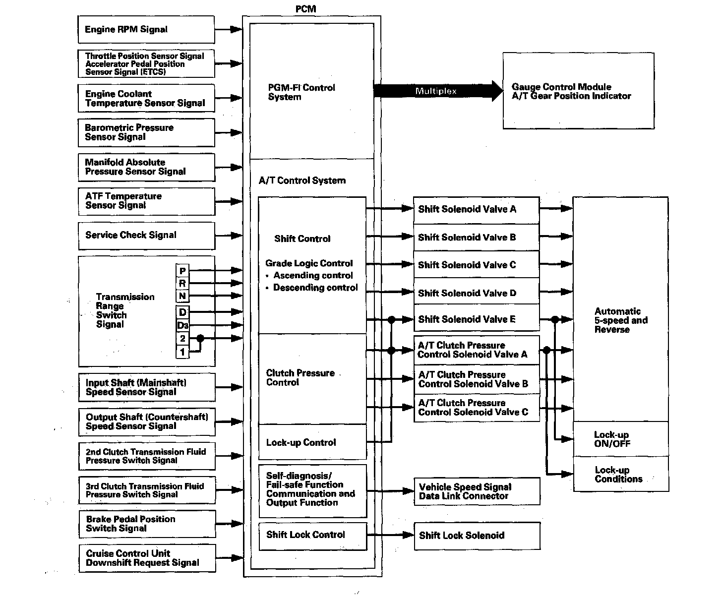 Also, a grade logic control system has been adopted to control shifting in D and D3 positions. The PCM compares actual driving conditions with memorized driving conditions, based on the input from the throttle position sensor (2003-2005 models), the accelerator pedal position sensor (2006 model), the engine coolant temperature sensor, the barometric pressure sensor, the brake pedal position switch signal, and the shift lever position signal, to control shifting while the vehicle is ascending or descending a slope.