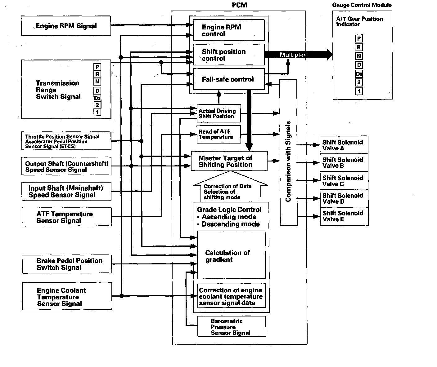 The PCM instantly determines which gear should be selected by various signals sent from sensors and switches, and it actuates the shift solenoid valves A, B, C, D, and E to control shifting.