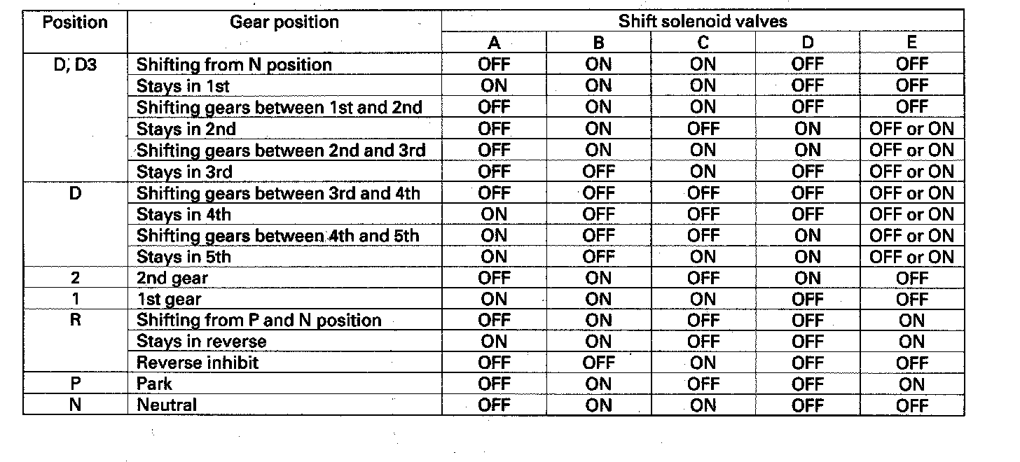 The PCM turns the shift solenoid valves A, B, C, D, and E ON and OFF to control transmission gear shifting. The combination of driving signals to shift solenoid valves A, B, C, D, and E are shown in the table.