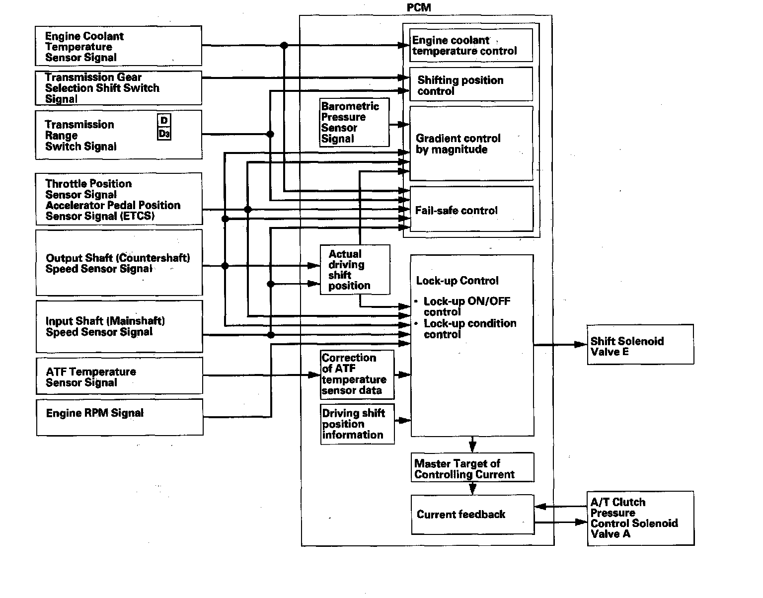 The PCM switches the shift solenoid valves and the A/T clutch pressure control solenoid valves to control shifting transmission gears and lock-up torque converter clutch.