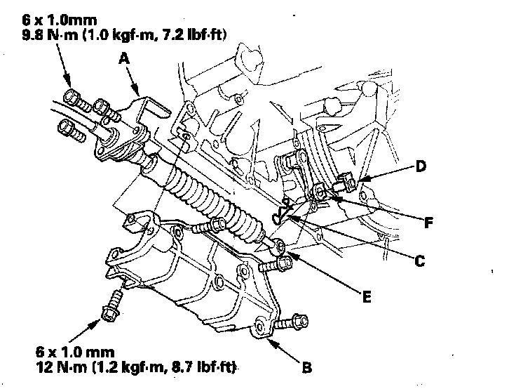9. Remove the spring clip (C) and control pin (D), then separate the shift cable (E) from the control lever (F).