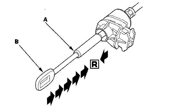 17. If necessary, push the shift cable until it stops, then release it. Pull the shift cable back one step so that the shift position is in R. Do not hold the shift cable guide (A) to adjust the shift cable (B).