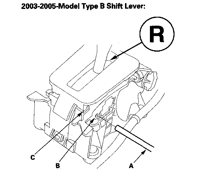 19. Insert a 6.0 mm (0.24 inch) pin (A) through the positioning hole (B) on the shift lever bracket base and into the positioning hole (C) on the shift lever. The shift lever is secured in the R position.