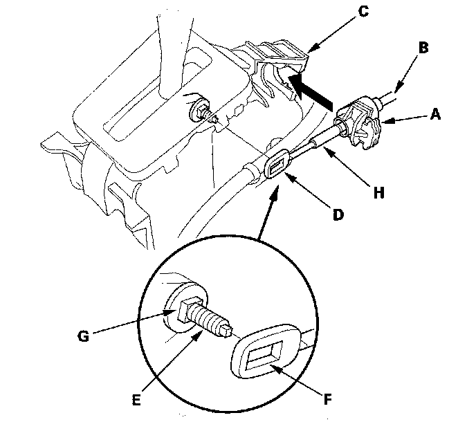 20. Align the socket holder (A) on the shift cable (B) with the slot in the bracket base (C), then slide the holder into base. Install the shift cable end (D) over the mounting stud (E) by aligning its square hole (F) with the square fitting (G) at the bottom of the stud. Push the holder until it snaps securely in place. Do not install the shift cable by holding the shift cable guide (H).