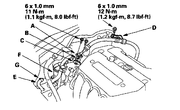 36. Connect the return the hose (E) to the power steering fluid reservoir (F), then secure the hose with is clamp (G).
