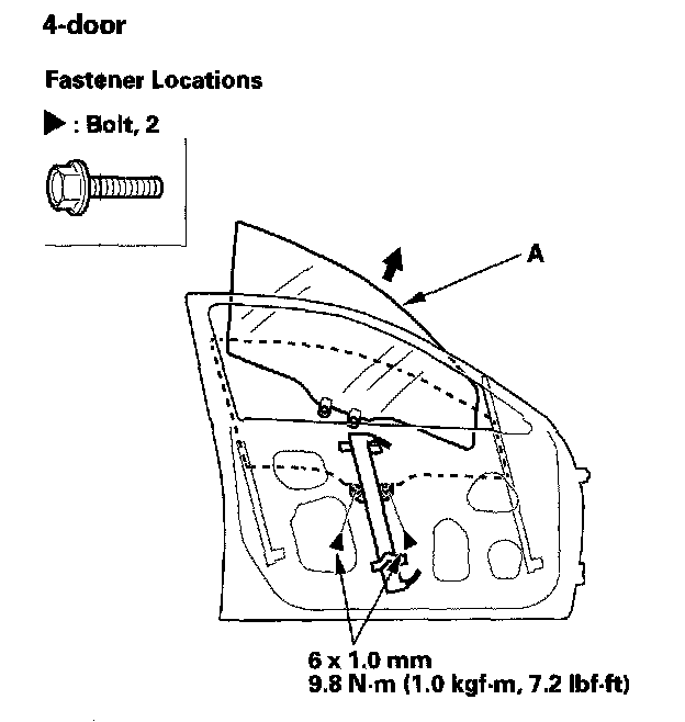 4. Carefully raise the glass (A) until you can see the bolts, then remove them. Carefully pull the glass out through the window slot. Take care not to drop the glass inside the door.