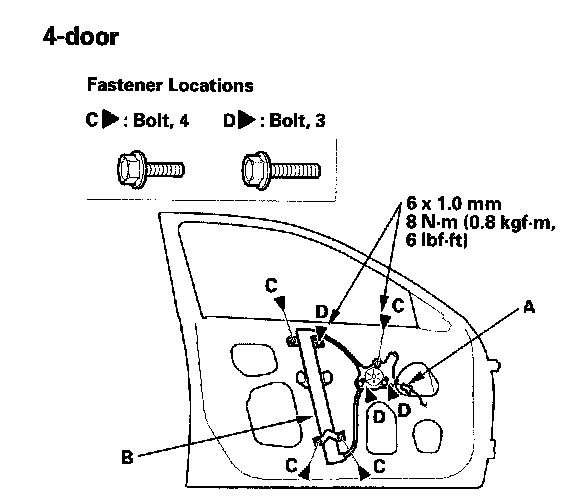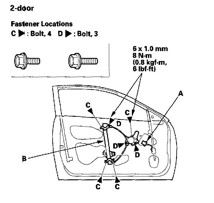6. Remove the bolts (C), and loosen the bolts (D), then remove the regulator through the hole in the door.