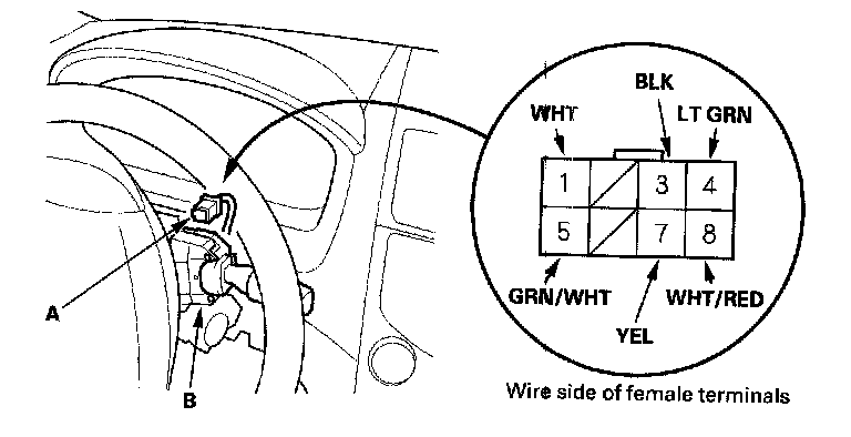4. Disconnect the 8P connector (A) from the wiper/washer switch (B).