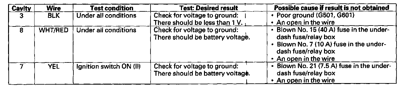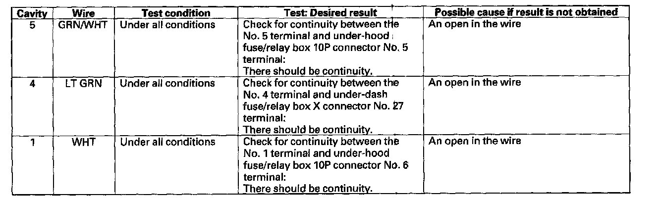 7. Disconnect the connector from the wiper/washer switch, and make these input tests at the connector.