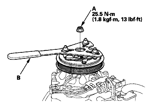 1. Remove the center nut (A) while holding the armature plate with a commercially available A/C clutch holder (B).