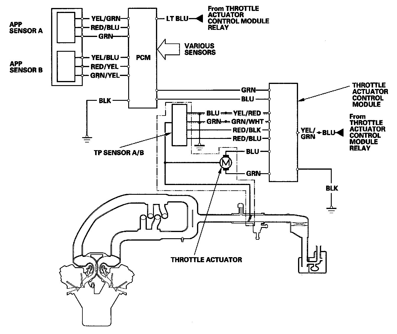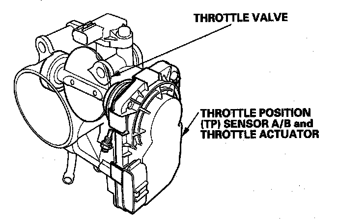 The electronic throttle control system consists of the throttle actuator, throttle position (TP) sensor A/B, accelerator pedal position (APP) sensor A/B, throttle actuator control module, and the PCM. The throttle is electronically controlled by this system.