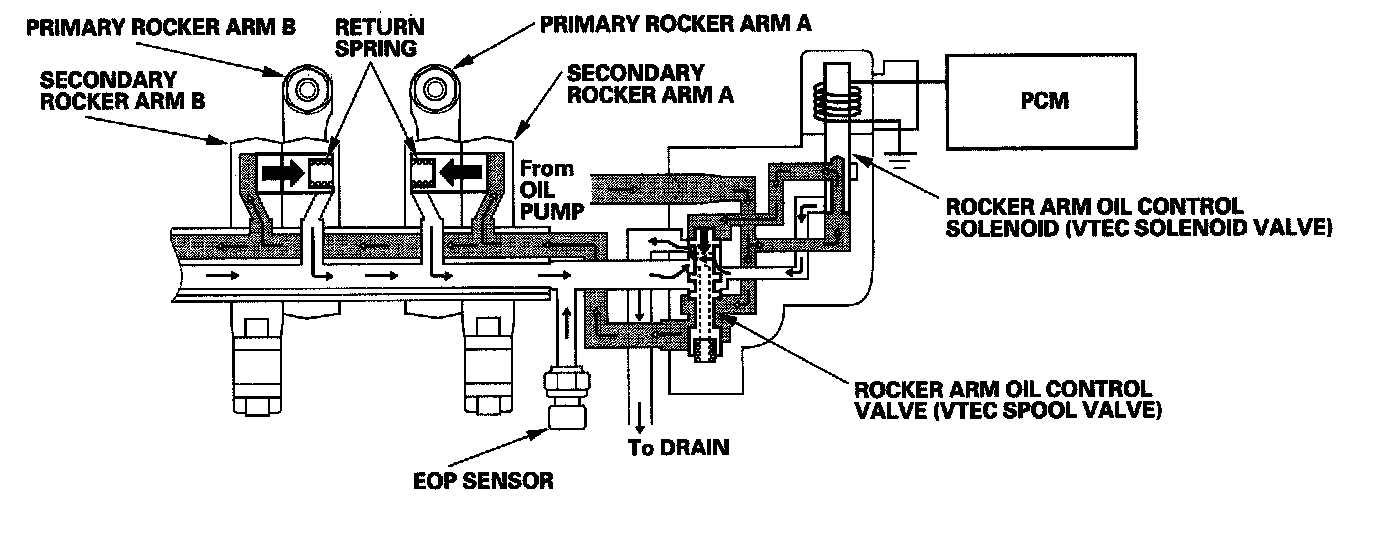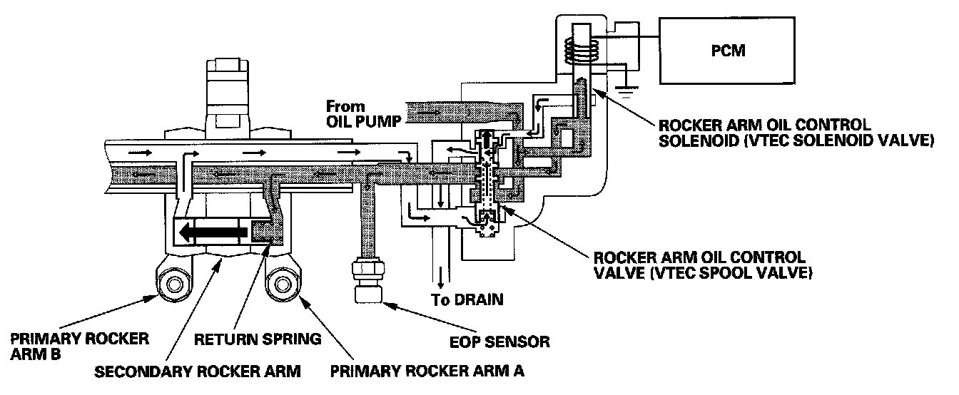 The rocker arm oil control valve (VTEC spool valve) switches oil pressure. Oil pressure then enters primary rocker arm B from the oil passage in the exhaust rocker shaft. This forces the VTEC switching piston into primary rocker arm A against the return spring and disengages the primary rocker arms from the secondary arms to stop valve actuation. The secondary rocker arm uses a lost motion spring to maintain tension.