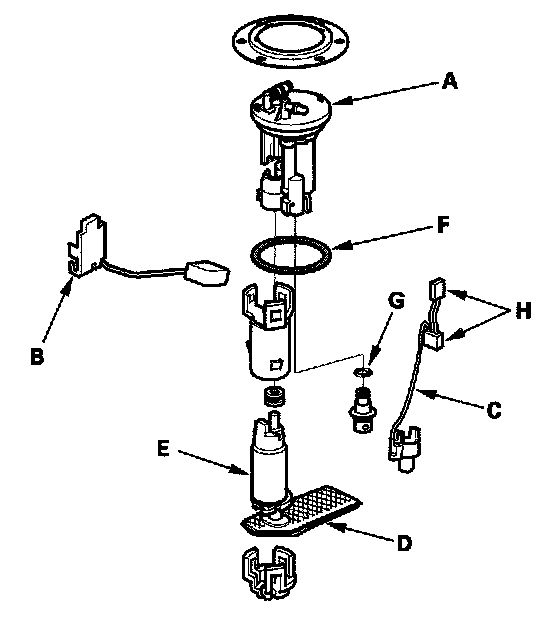 3. Remove the strainer case (A), the fuel gauge sending unit (B), and the wire harness (C).