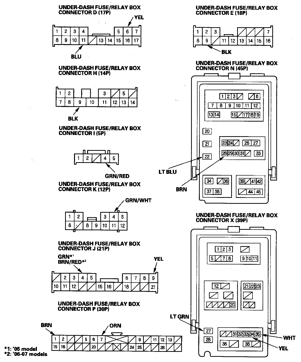 2. Disconnect the under-dash fuse/relay box connectors D, E, H, I, J, K, N, P and X.