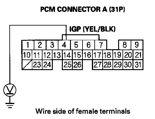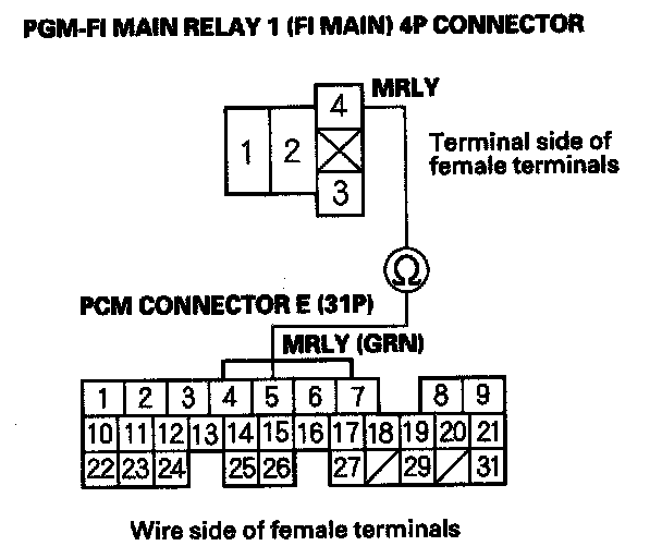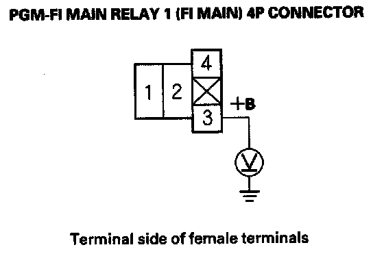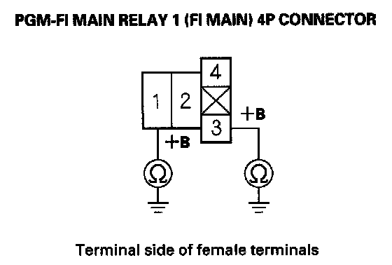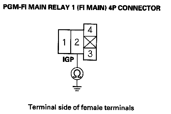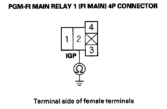 27. Check for continuity between body ground and PGM-FI main relay 1 (FI MAIN) 4P connector terminals No. 1 and No. 3 individually.