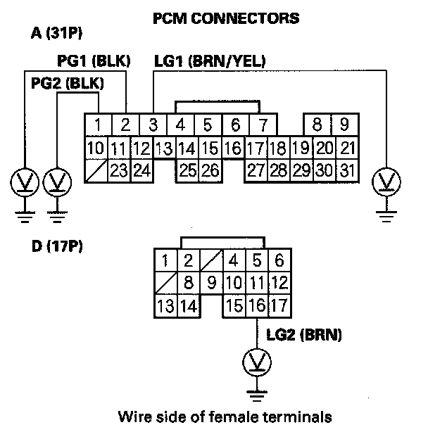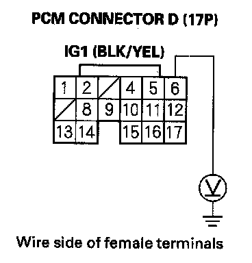 32. Measure voltage between PCM connector terminal D6 and body ground.