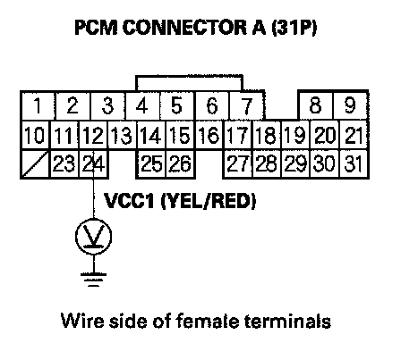 53. Disconnect the connector from each of the following sensors, one at a time, and measure voltage between body ground and PCM connector terminal A12 with the ignition switch ON (II).