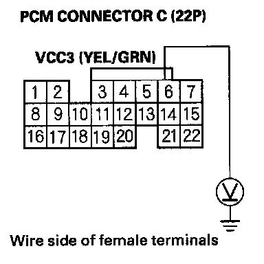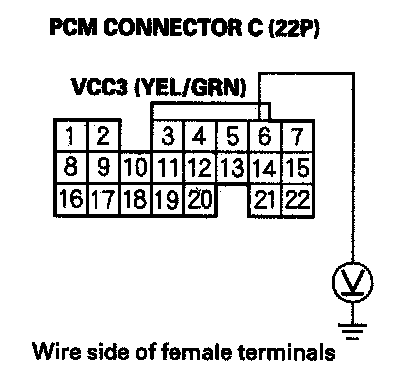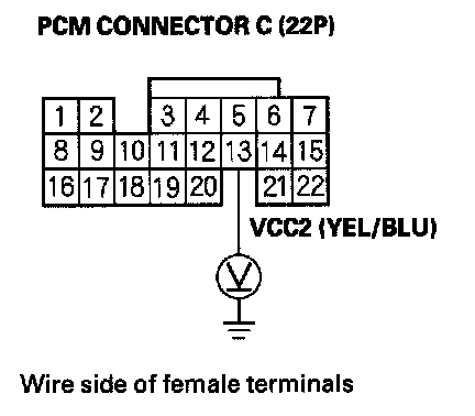 61. Disconnect the connector from each of the following sensors, one at a time, and measure voltage between body ground and PCM connector terminal C13 with the ignition switch ON (II).