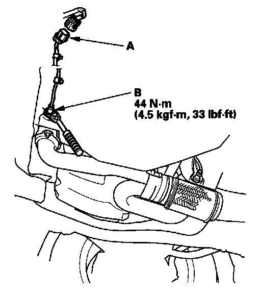1. Disconnect the front secondary HO2S 4P connector (A), then remove the front secondary HO2S (B) with an 02 sensor socket wrench.