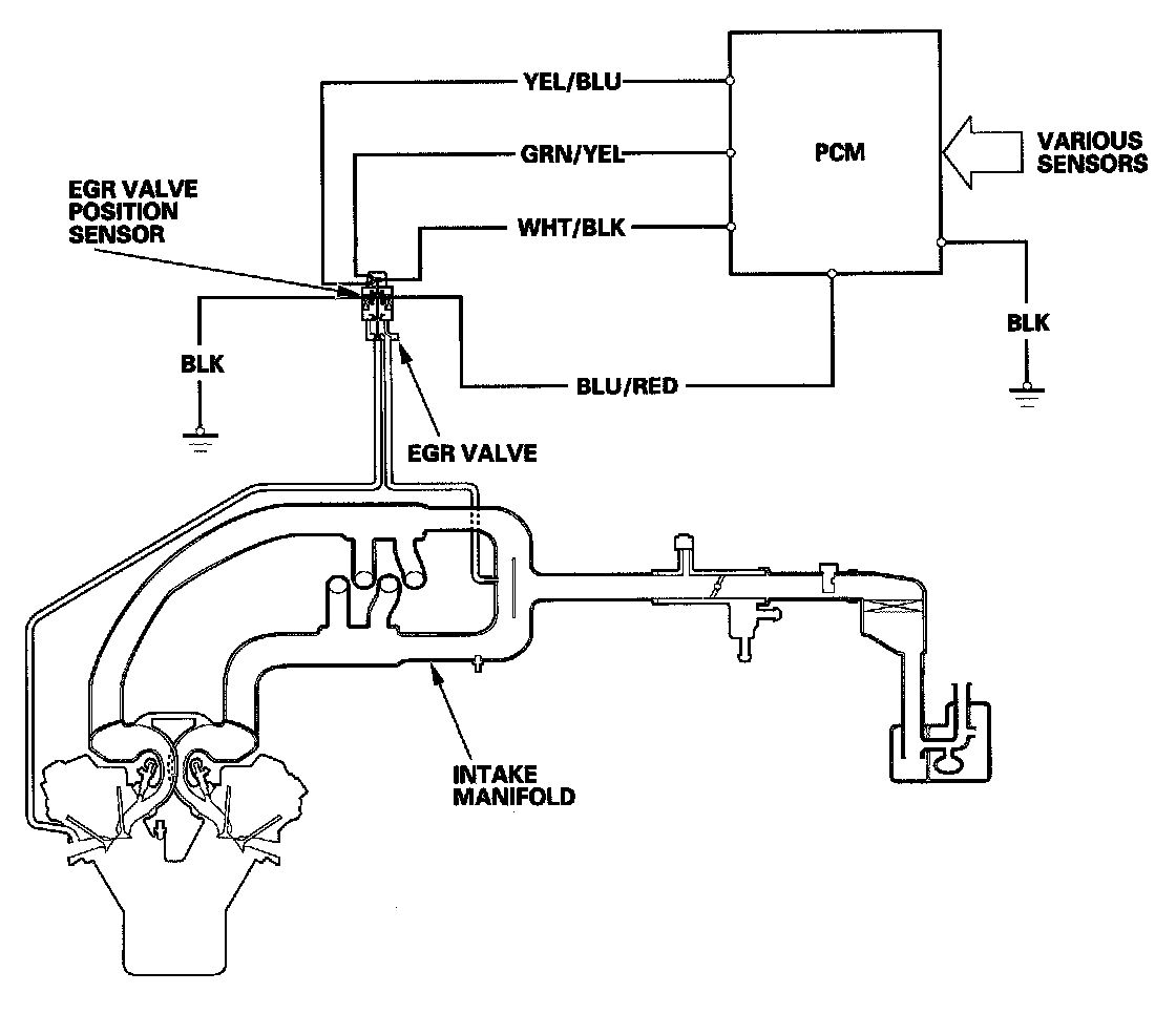The EGR valve position sensor detects the amount of EGR valve lift and sends it to the PCM. The PCM then compares it with the ideal lift in its memory (based on signals sent from other sensors). If there is any difference between the two, the PCM cuts current to the EGR valve.
