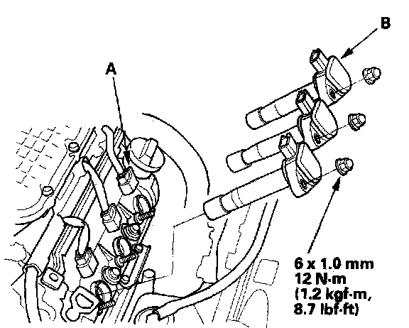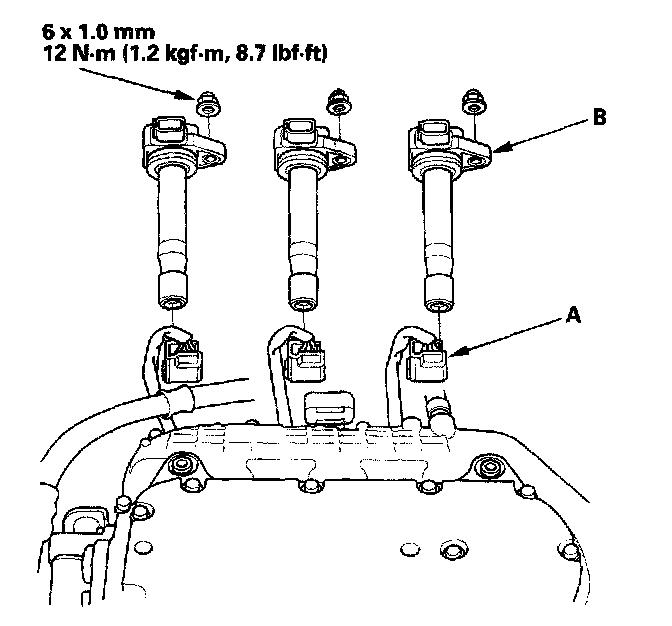 3. Disconnect the ignition coil connectors (A), then remove the front bank ignition coils (B).