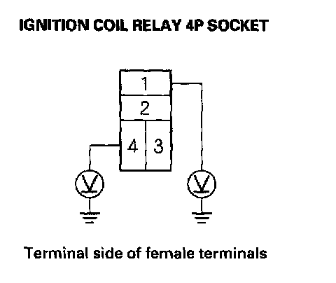 3. Measure the voltage between ignition coil relay 4P socket terminal No. 1 and body ground, then terminal No. 4 and body ground.