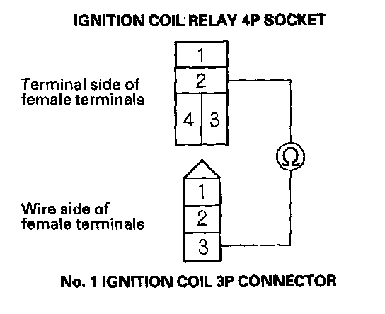4. Check for continuity between ignition coil relay 4P socket terminal No. 2 and the No. 1 ignition coil 3P connector terminal No. 3.