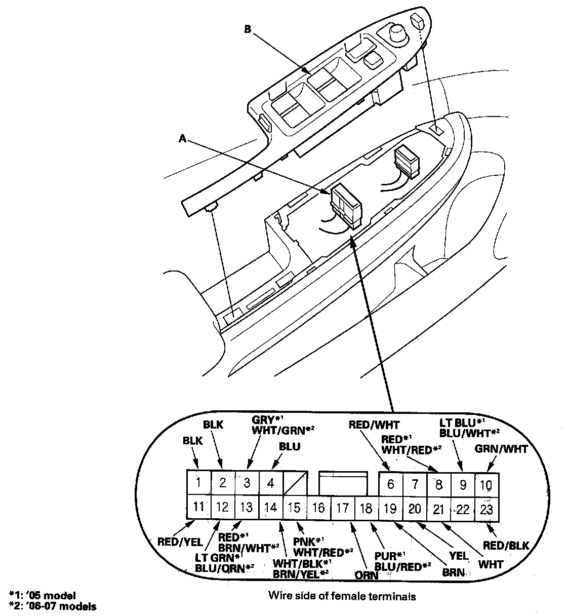 3. Disconnect the 23P connector (A) from the power window switch (B).