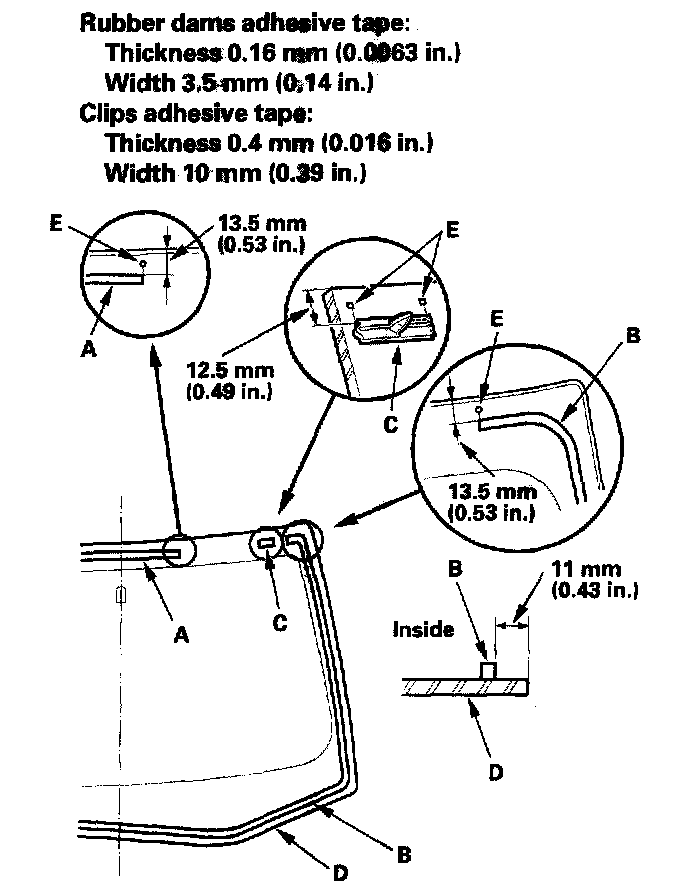 11. Attach the upper rubber dam (A), lower rubber dam (B), and clips (C) with adhesive tape to the inside face of the windshield (D) as shown: