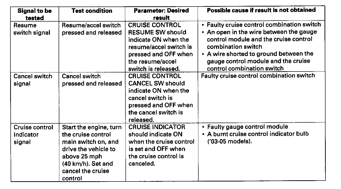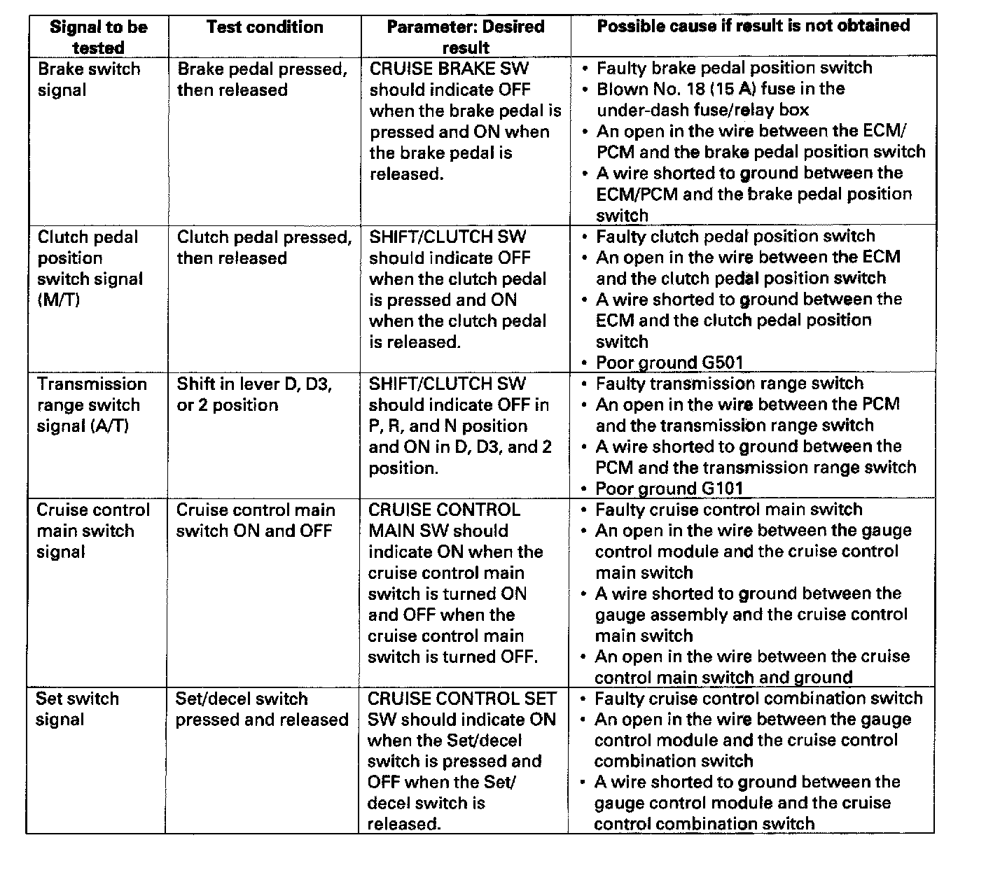 NOTE: Intermittent failures are often caused by loose circuit connections. While monitoring cruise control inputs, flex their circuits, and note if any of the test result change.
