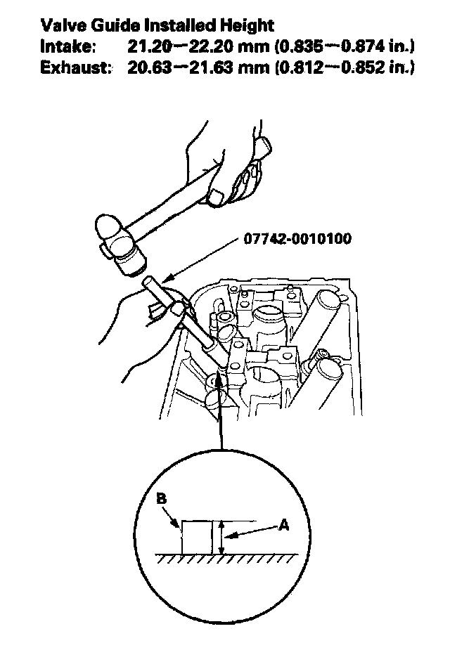 9. Apply a thin coat of clean engine oil to the outside of the new Valve guide. Install the guide from the camshaft side of the head; use the special tool to drive the guide to the specified installed height (A) of the guide (B). If you have all 12 guides to do, you may have to reheat the head.