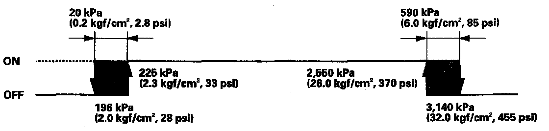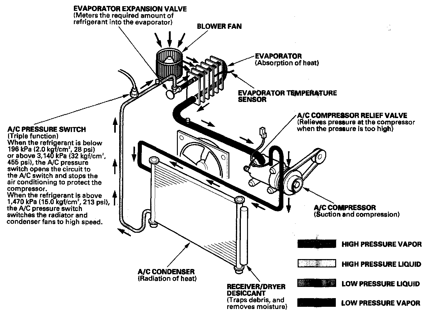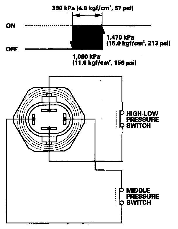 If the refrigerant pressure goes above or below 1,470 kPa (15.0 kgf/sq.cm, 213 psi), the A/C pressure switch opens or closes to signal the PCM to change the speed of the condenser fan and radiator fan (high-low).