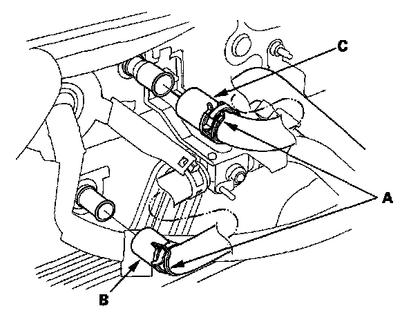 6. Slide the hose clamps (A) back, then disconnect the inlet heater hose (B) and the outlet heater hose (C) from the heater unit. Engine coolant will run out when the hoses are disconnected; drain it into a clean drip pan. Be sure not to let coolant spill on the electrical parts or the painted surfaces. If any coolant spills, rinse it off immediately.