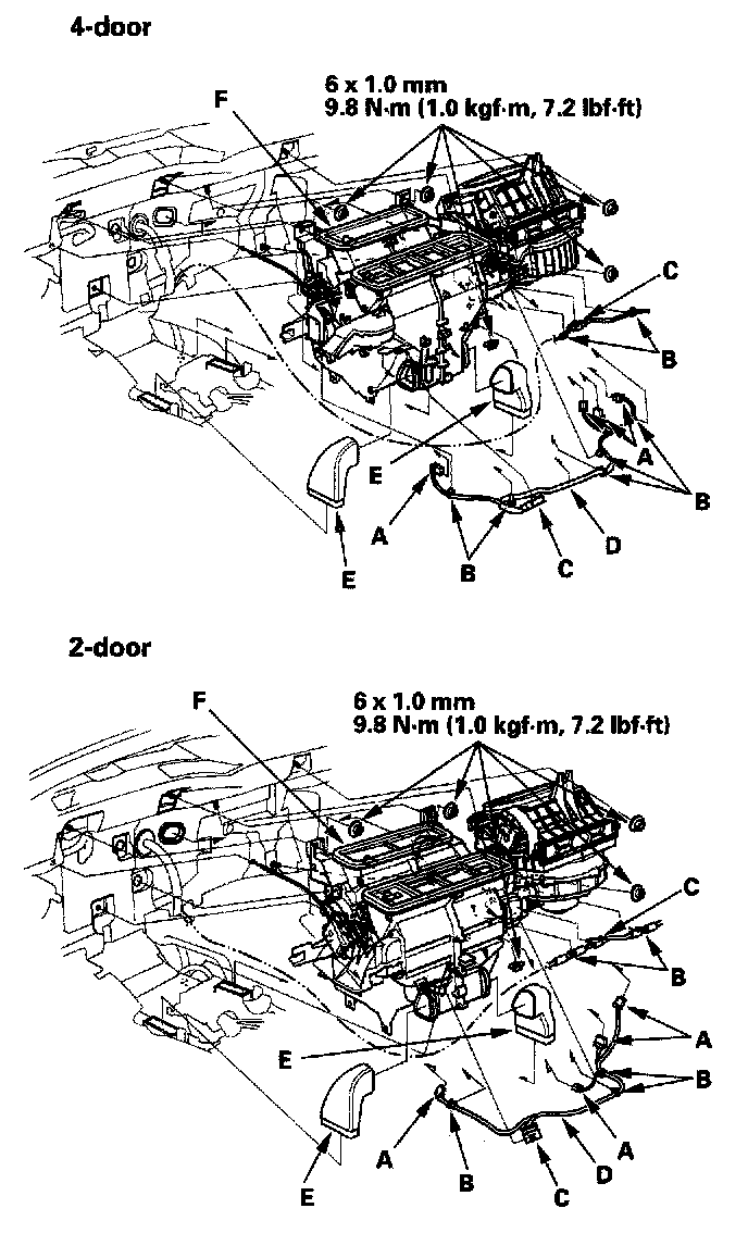 9. Disconnect the connectors (A) from the air mix control motor, the evaporator temperature sensor, the power transistor, and the recirculation control motor, then remove the wire harness clips (B), the connector clips (C) and the wire harness (D). Remove the heater ducts (E), then remove the mounting nuts and the blower-heater unit (F).