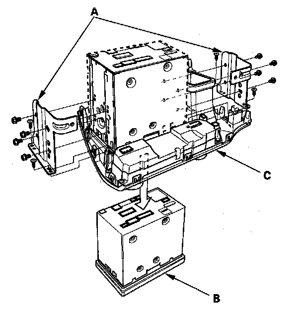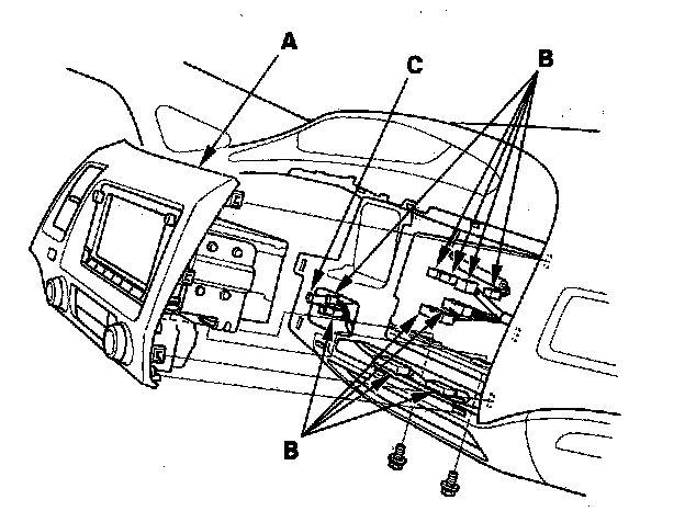 5. Remove the screws, brackets (A), and the navigation unit (B) from the center panel (C).