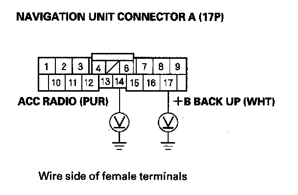 Navigation frequently asks for anti-theft code and needs GPS initialization1. Measure the voltage between navigation unit connector A (17P) terminal No. 14 and body ground, and between terminal No. 17 and body ground.