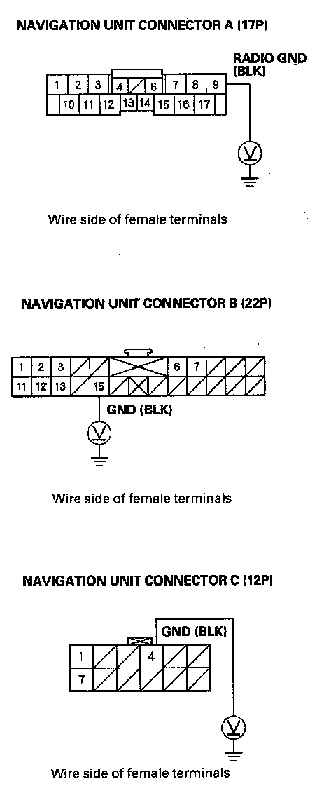 2. Measure the for voltage between navigation unit connector A (17P) terminal No. 9 and body ground, between navigation unit connector B (22P) terminal No. 15 and body ground, and between navigation unit connector C (12P) terminal No. 4 and body ground.