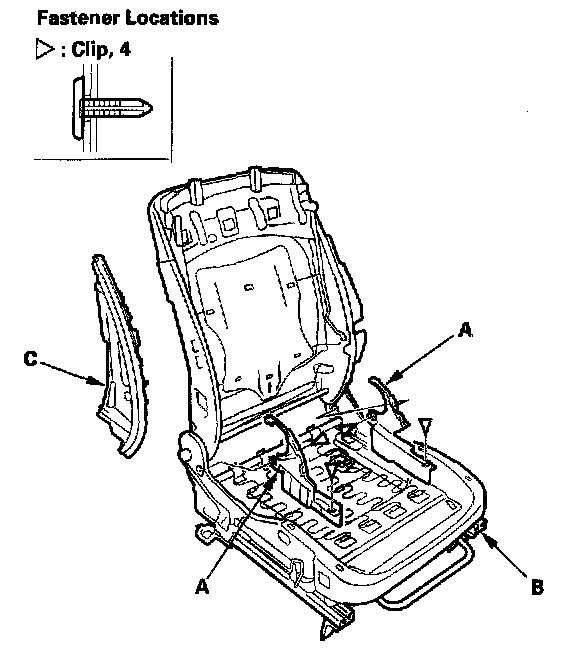 3. Remove the clip, then remove the recline inner covers (A) from the seat frame (B), and remove the module holder (C).