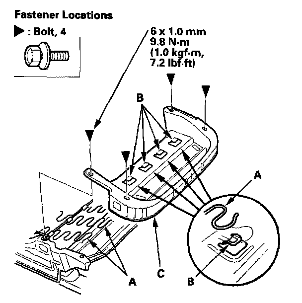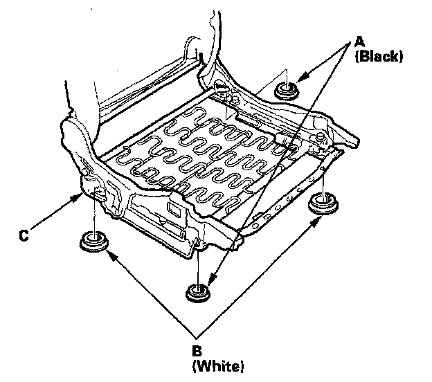 4. Remove the bolts, and release the seat cushion springs (A) from the hooks (B), then remove the seat cushion frame (C).