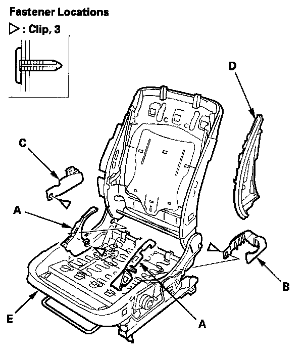 3. Remove the clips, then remove the recline inner covers (A), outer upper rail cover (B), inner upper rail cover (C) and the module holder (D) from the seat frame (E).