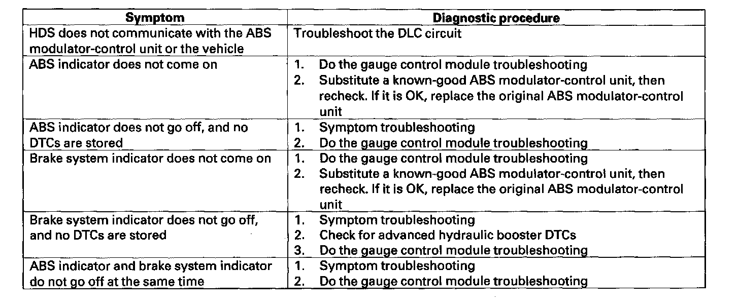 Symptom Troubleshooting IndexWhen the vehicle has one of these symptoms, check for a diagnostic trouble code (DTC) with the HDS. If there is no DTC, do the diagnostic procedure for the symptom, in the sequence listed, until you find the cause.