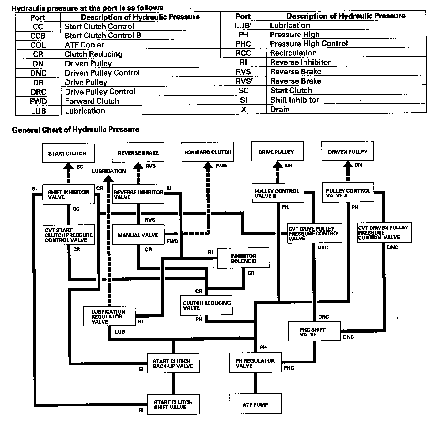 The manual valve is shifted into the D position, and uncovers the port leading forward clutch pressure (FWD) to the forward clutch. The forward clutch pressure (FWD) flows to the forward clutch, the forward clutch is engaged, and drives the input shaft and drive pulley shaft. The drive pulley receives low pressure, and driven pulley receives high pressure. The PCM actuates the CVT start clutch pressure control valve to control start clutch pressure. The start clutch control pressure (CC) from the CVT start clutch pressure control valve becomes the start clutch pressure (SC) at the shift inhibitor valve, and flows to the start clutch. The start clutch is engaged, and the vehicle moves.