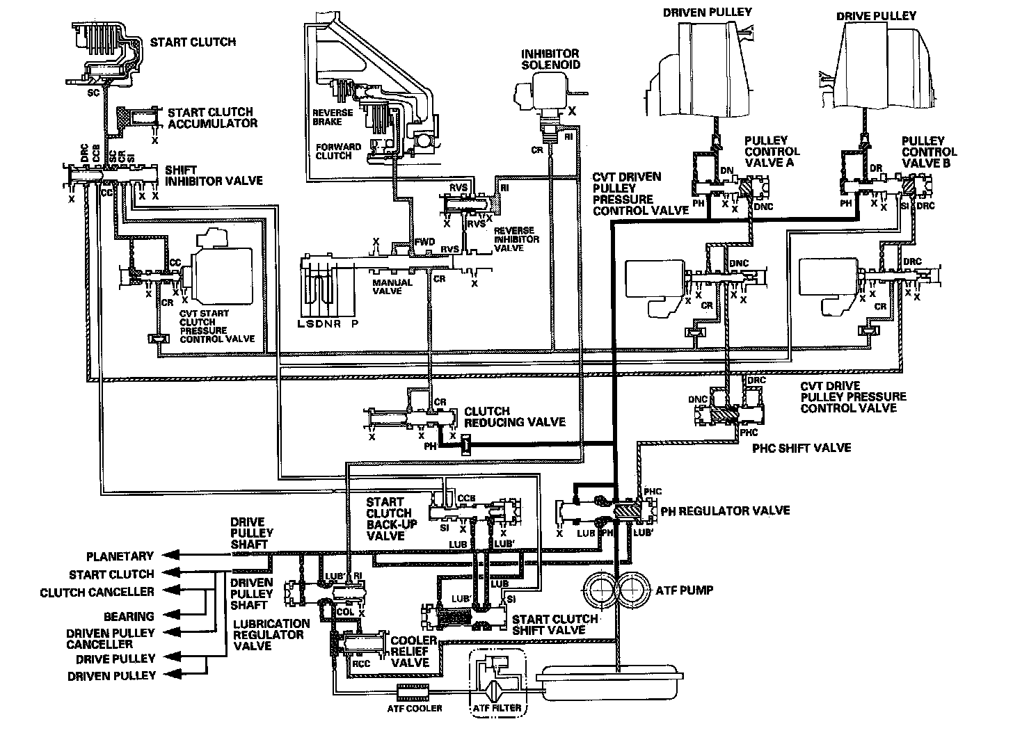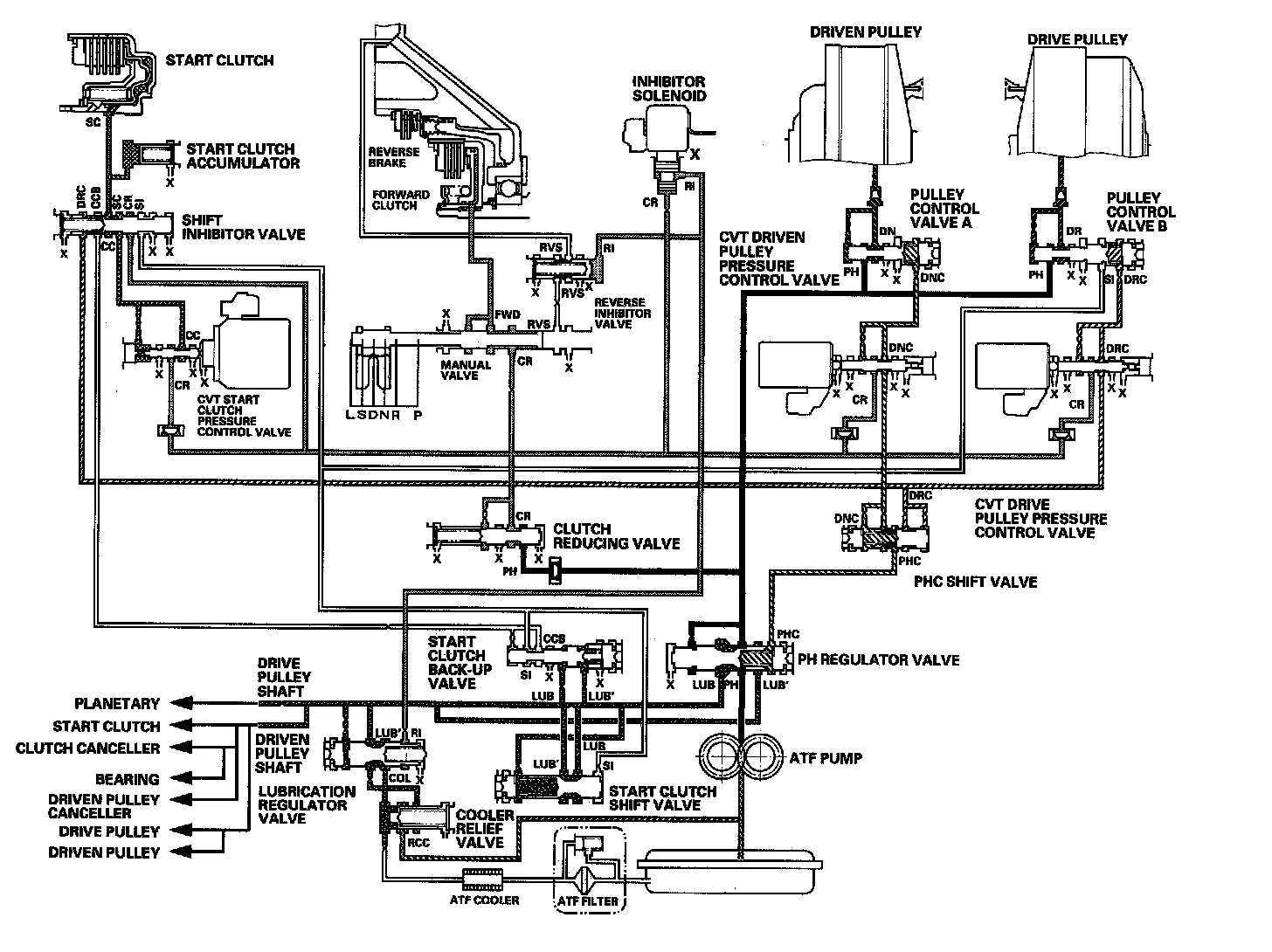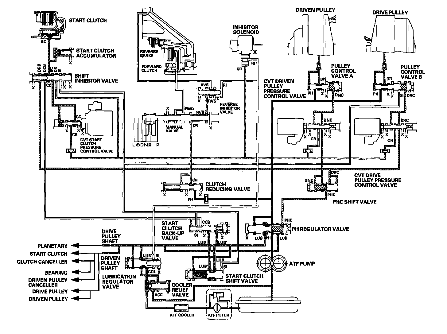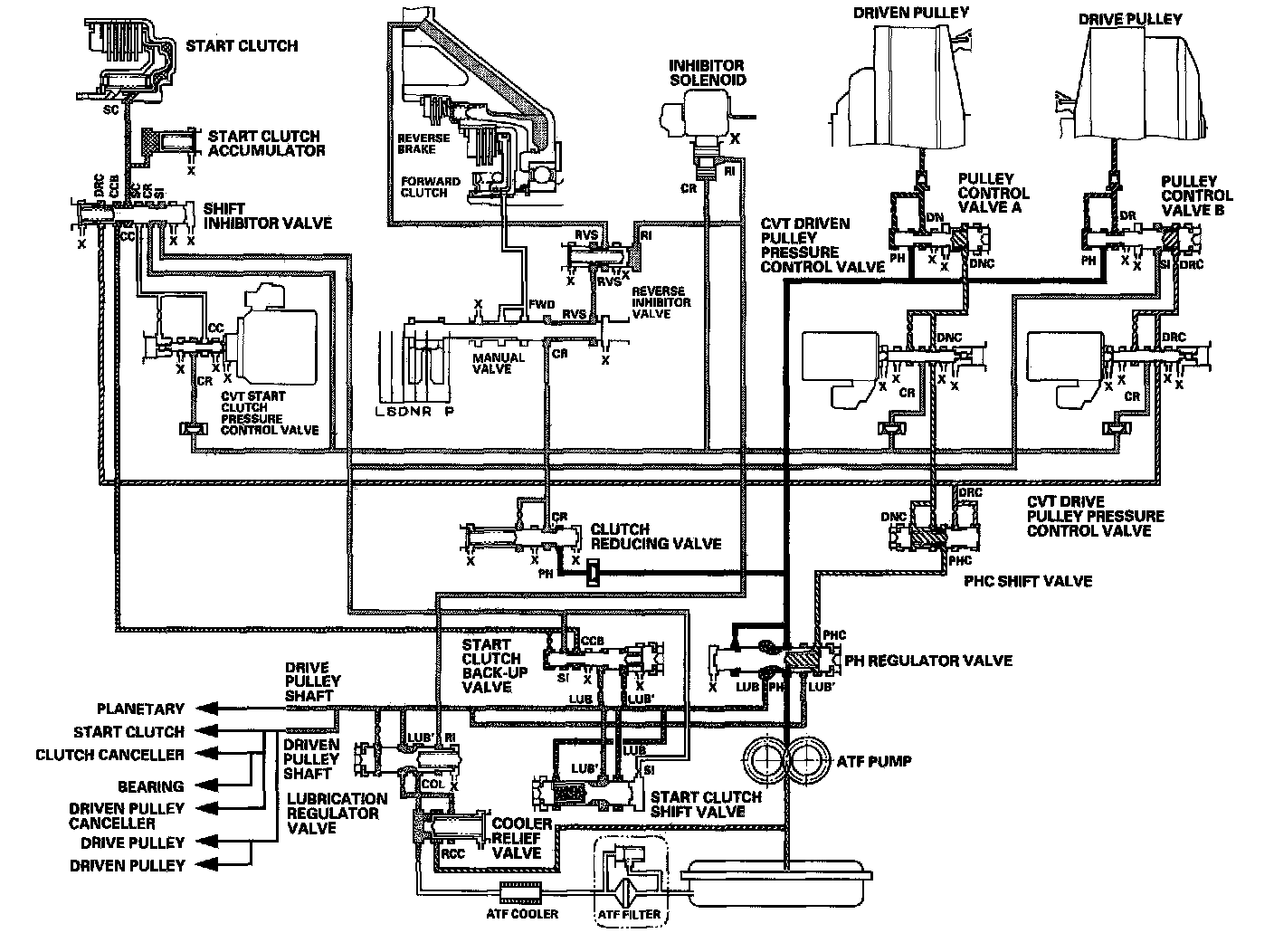 Fluid from the ATF pump is regulated to high pressure at the PH regulator valve, and flows to the pulley control valves. The CVT driven pulley pressure control valve and the CVT drive pulley pressure control valve control pulley control valves A and B to apply pressure to the pulleys. The driven pulley receives pressure higher than the pressure drive pulley receives, but hydraulic pressure to the forward clutch is intercepted by the manual valve and to the start clutch is intercepted by the CVT start clutch pressure control valve. Under this condition, hydraulic pressure is not applied to the start and forward clutches.